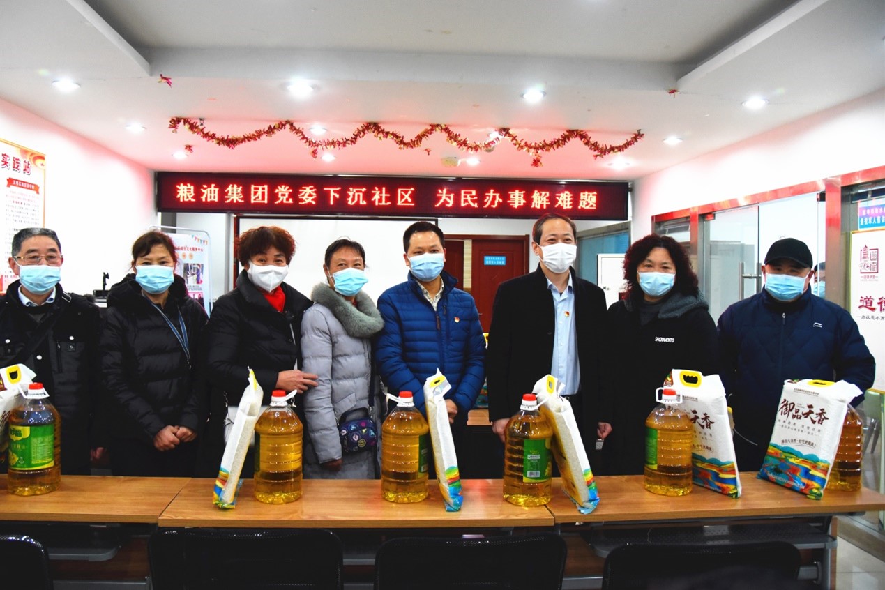 2021年1月29日,糧油集團黨委書記、董事長周勇,黨委委員、總經理宛三林走進取水樓社區,開展2021年春節慰問社區困難群眾活動,為困難居民們送去米、油等慰問物資和節日祝福。