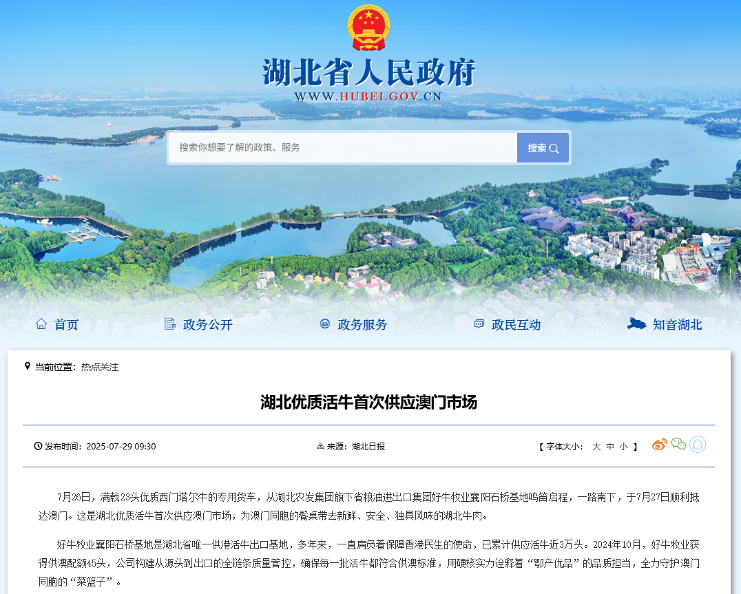 湖北省人民政府:湖北優質活牛首次供應澳門市場