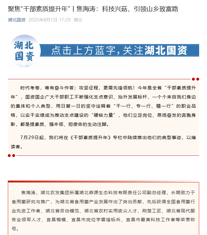 湖北省國資委:聚焦“干部素質提升年”丨焦海濤:科技興菇,引領山鄉致富路